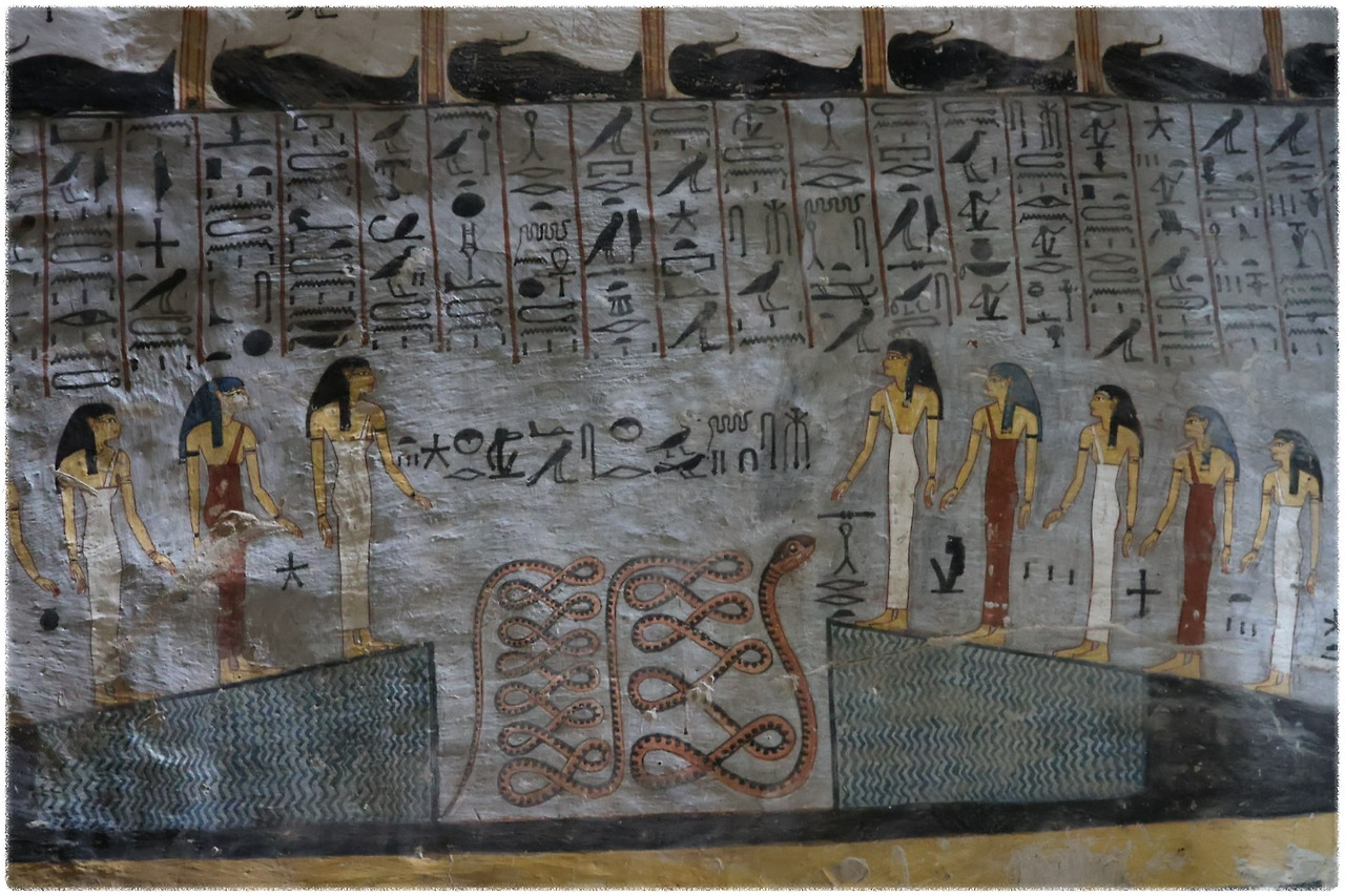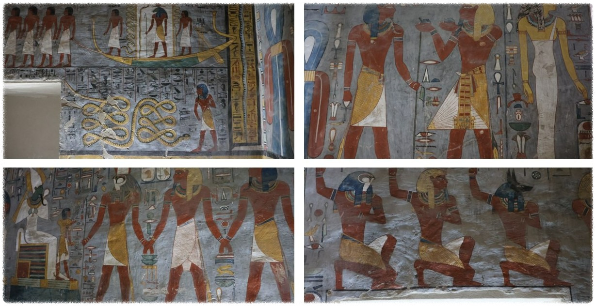 짙은 붉은색, 금빛 노랑, 깊은 남색으로 채색된 인물들은, 마치 시간이 멈춘 듯 벽 너머에서 걸어 나올 것 같았다. 한 벽면에는 죽은 왕을 이끌고 가는 신들의 모습이 그려져 있었다. 뱀과 배, 그리고 망자를 인도하는 신들.