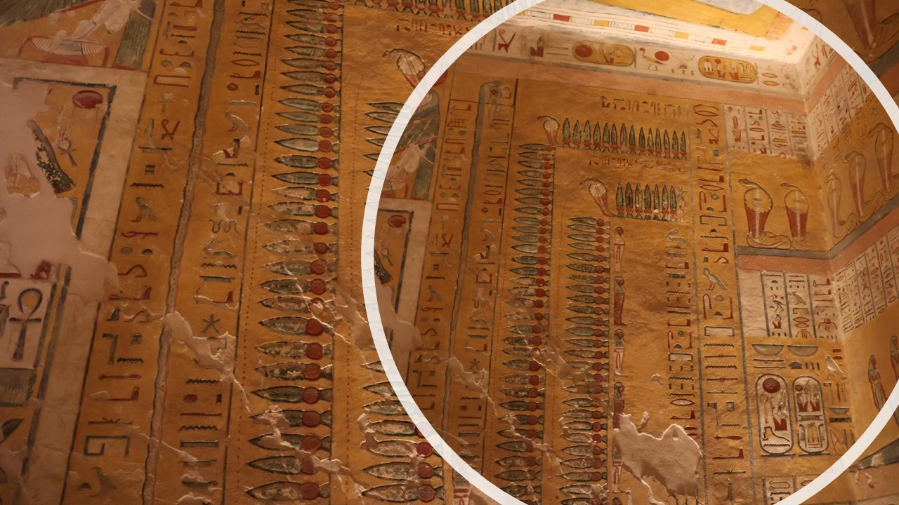 수천 년이 지나도 그 자리에 그대로 남아 있는, 움직이지 않음 속의 생명. 마치 이 무덤을 설계한 누군가가 죽음을 기록하되, 완전히 죽음으로 덮어두지는 않겠다는 의지를 남긴 것 같았다. 벽면은 분명히 죽음을 말하고 있었다.