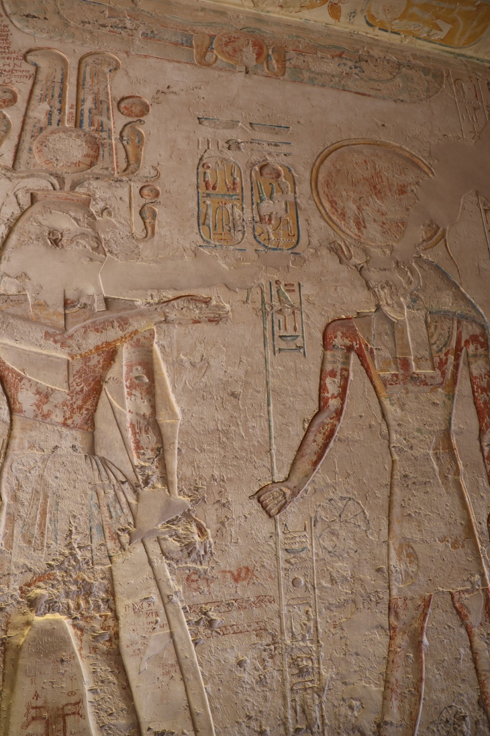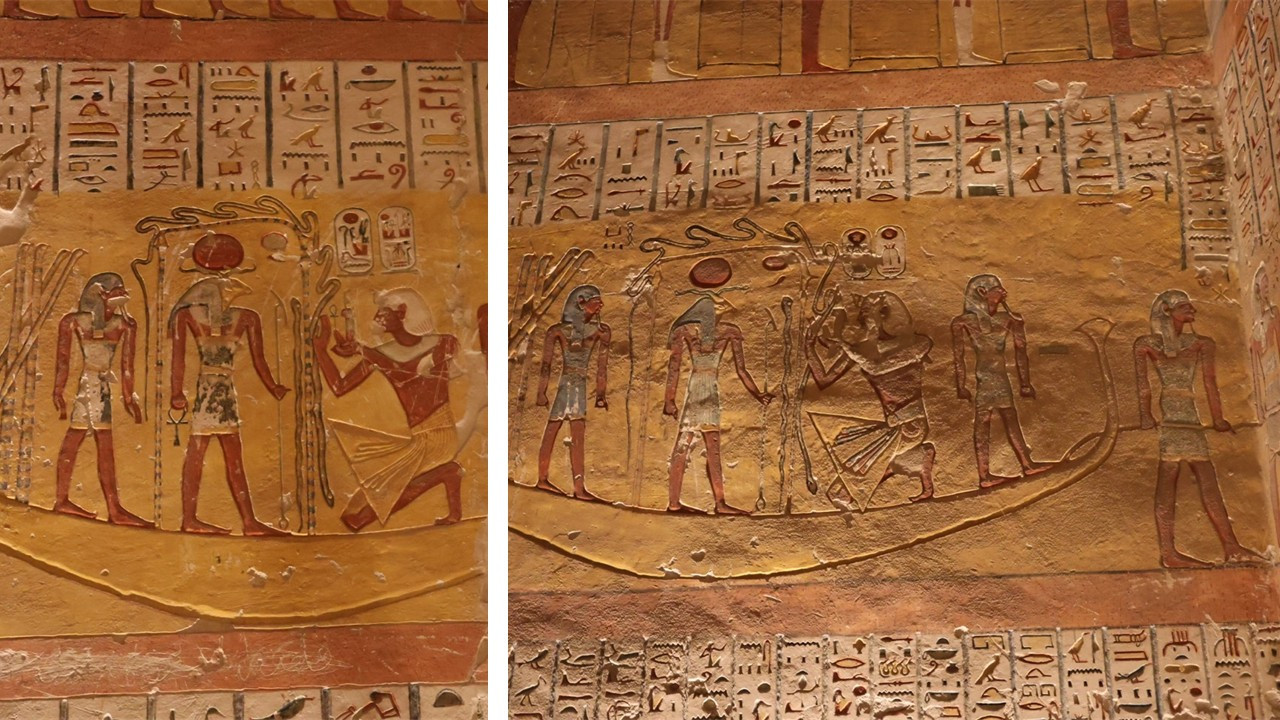 통로를 따라 몇 걸음 더 들어가자, 왼편 벽에 정교한 부조가 나타났다. 태양신 라(Ra)가 손에 셉터를 들고 서 있고, 그 앞에 고개 숙인 파라오가 손을 들어 인사를 하고 있었다. 이 장면은 단순한 인사 이상의 것을 말한다. 파라오는 단지 인간 왕이 아니라, 신의 아들로서 이 지상에 내려온 존재다. 그러니 그의 죽음은 단순한 끝이 아니라, 원래의 자리로 돌아가는 귀환이어야 했다. 그가 태양의 신 앞에 다시 나아가 고개를 숙이는 이 벽면은, 죽음 이후를 그리기 이전에 삶의 태도를 새기고 있었다.