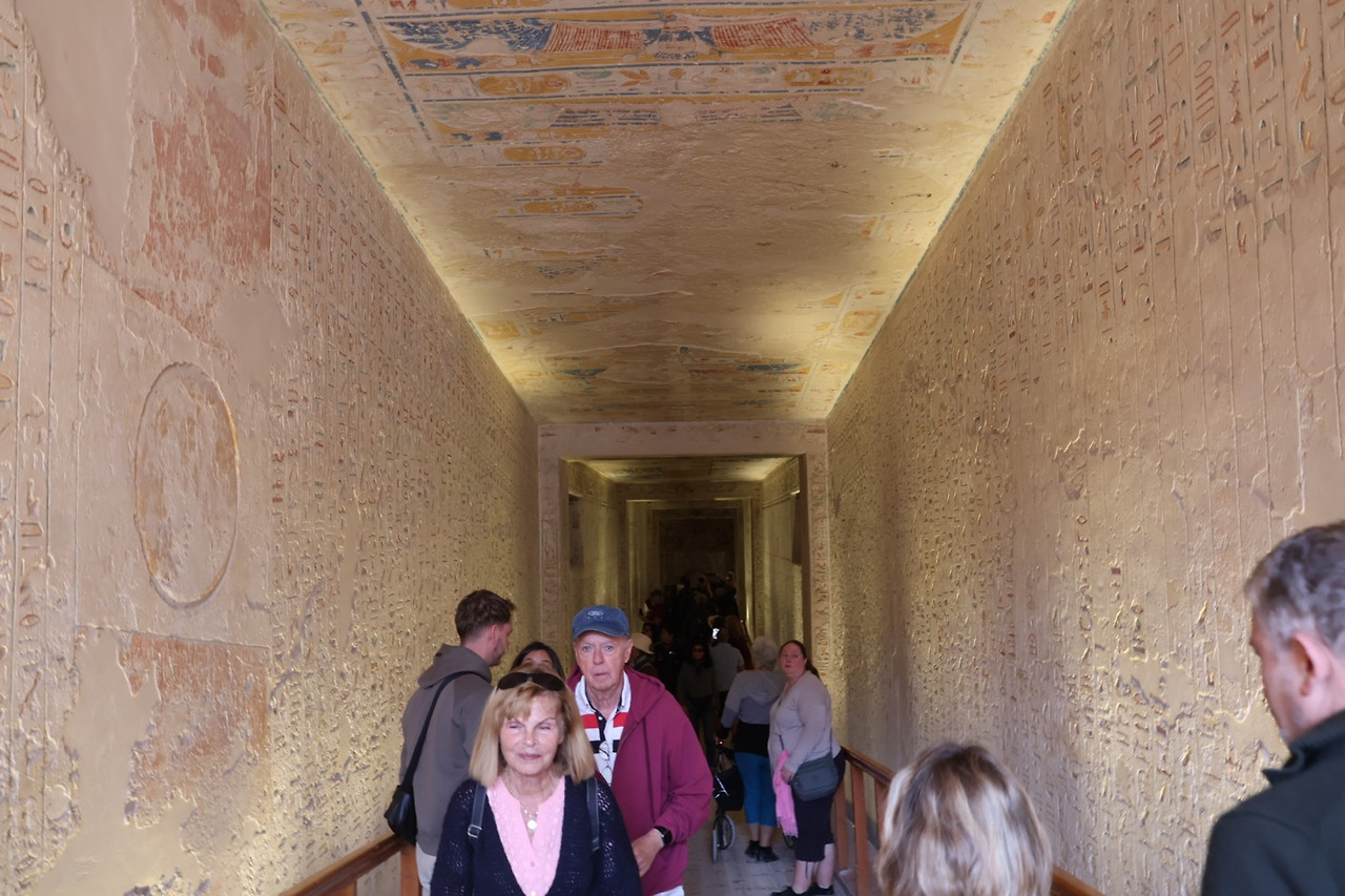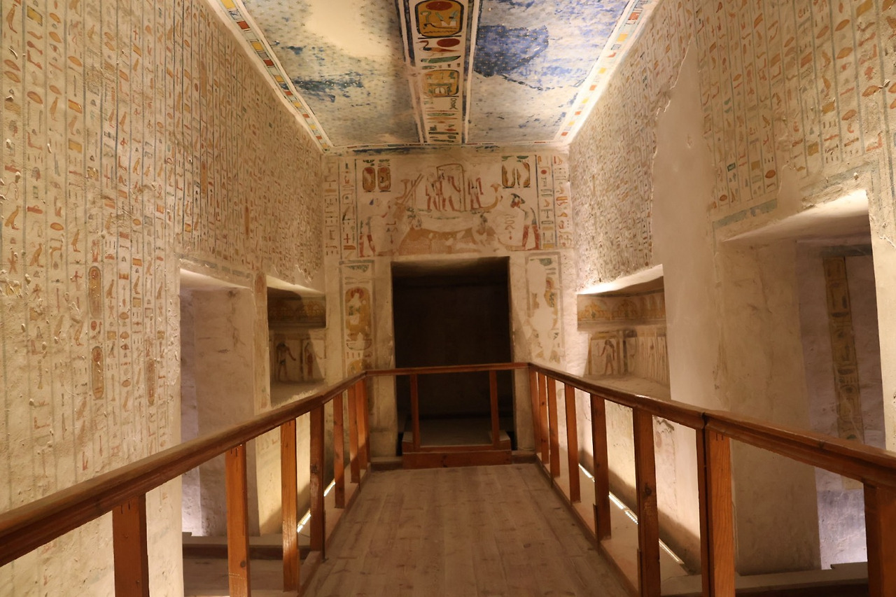 길고 낮은 경사로가 안으로 이어졌다. 천장은 황금색 별로 뒤덮인 하늘이었고, 양 벽에는 끝도 없이 이어지는 상형문자들이 새겨져 있었다. 그 글자들은 단지 ‘말’이 아니었다. 마치 시간이 직접 돌에 새겨져 있는 듯했다. 왕이 누구였는지를 설명하기보다는, 그가 어떤 여정을 떠나야 하는지를 기록한 이야기. 별은 천장을 덮고, 문자는 벽을 감싸고 있었다. 나는 무덤에 들어섰다기보다, 하나의 신화 속으로 걸어 들어가는 기분이었다.