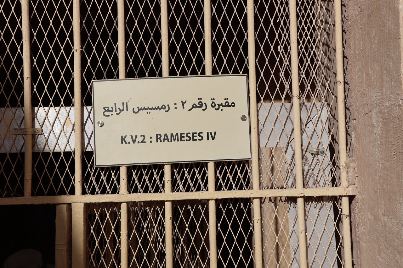 아무런 조형 장식도 없이 덩그러니 놓인 철문, 그리고 그 위에 부착된 금속 표지판 하나. “KV2: RAMESSES IV”라는 문구가 아랍어와 영어로 병기되어 있었지만, 그 글씨마저 빛에 바랜 듯 무심해 보였다. 람세스라는 이름이 가진 무게를 떠올렸을 때, 그 입구는 놀랄 만큼 조용하고 절제된 문턱이었다.