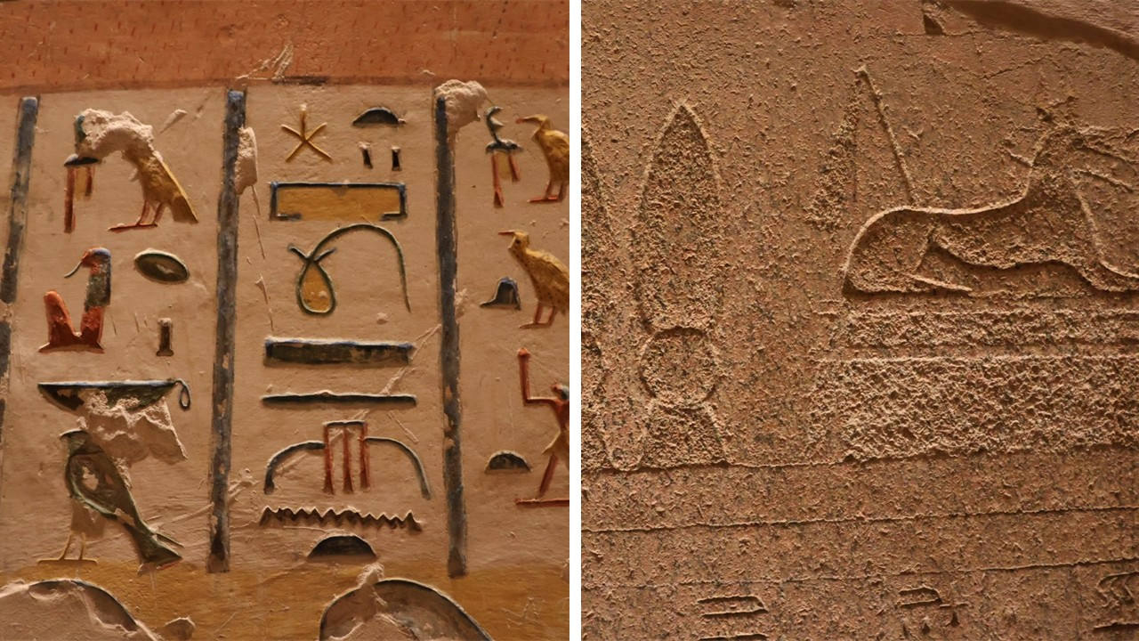 그 아래, 상형문자가 시작되었다. 그것은 단지 돌에 새겨진 문장이 아니었다. 먼저 눈에 들어온 것은 색이었다. 붉은색으로 칠해진 바탕이 벽면에 고르게 깔려 있었고, 그 위에 검고 푸른 선들이 선명하게 얹혀 있었다. 문자의 선은 곧았고, 곡선은 매끄러웠으며, 색은 아직도 살아 있는 듯했다.