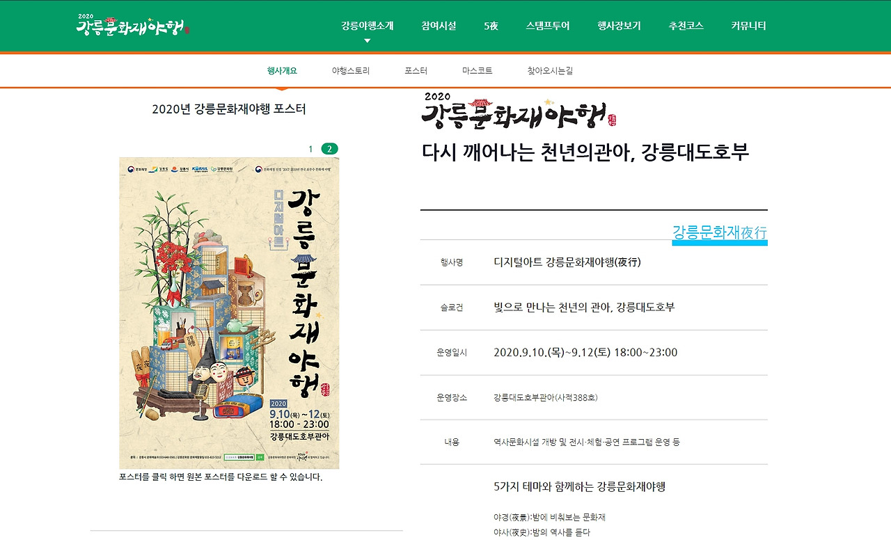 강릉의 문화재 '강릉대도호부관아'를 중심으로 진행하는 밤 행사로, 원래 강릉문화재야행은 문화와 함께 어우러지는 행사지만, 2020년은 코로나로 인해 거리두기를 기반으로 한 야행이 진행됐습니다.