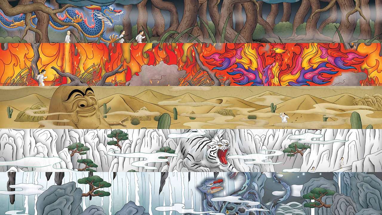그리고 KBS와 영상팀에서 이미지의 풍부함과 다소 강렬한 비주얼을 선호했는데, 나는 각 챕터마다 다양한 컬러로 보여지기 보다 뉘앙스를 맞추고자 했다. 예를 들면 '목'의 청룡을 마치 바람처럼 표현하여 푸른 계열로만, 그리고 현무는 최대한 톤다운을 한 물의 형태로 표현하고자 했다. 하지만 컨펌 후 최종 영상에서는 청룡과 현무는 원래 색감 및 비주얼로 들어가게 되었다.