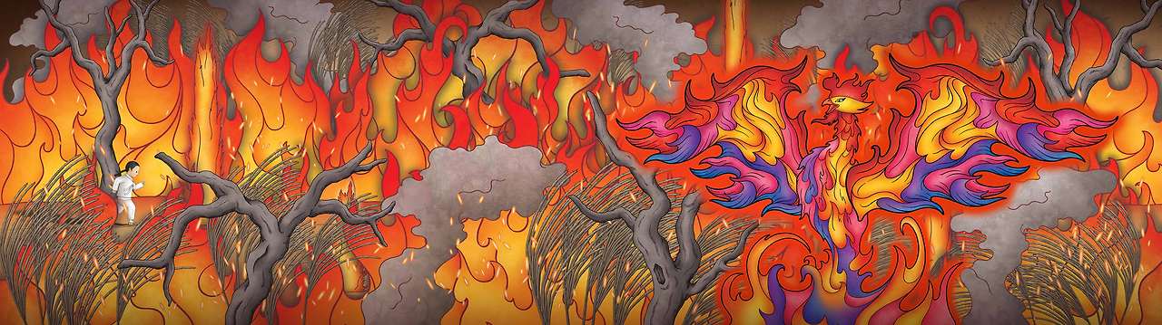 쥐불놀이가 돌아가며, 화염속에서 탄생하는 주작(봉황)