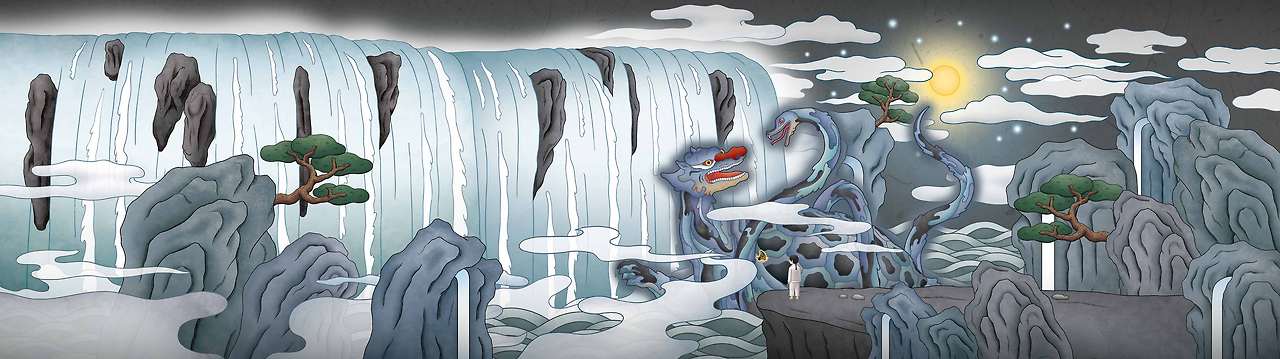 튀어오르는 흑색 잉어와 파도 속의 현무