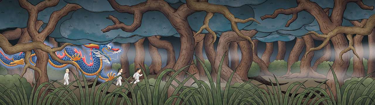 우거진 푸른 소나무숲과 붓꽃, 그리고 푸른 호수 위의 청룡