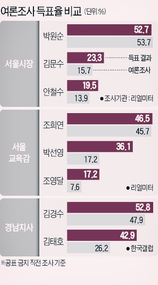 **지방선거 직전에 실시한 여론조사 결과와 실제 득표율 차이. 진보 후보들에 대한 여론조사 지지율과 실제 득표율은 거의 비슷하지만, 보수 후보들에 대한 것은 차이가 매우 크다. 이는 보수 성향 유권자들이 진보 성향 유권자들에 비해 잘 응답하지 않는다는 것, 즉 여론조사에서 잡히지 않아 과소표집되었다는 증거이다.