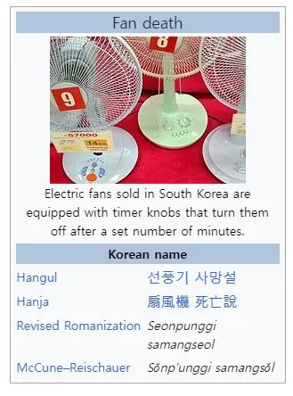 놀랍게도 위키피디아 영어버전에는 선풍기 틀면 죽는다는 내용을 한 면 가득히 조목조목 서술하고 있었다. 그것도 한국의 미신(myth)이라는 황당하고도 불쾌한 말로..