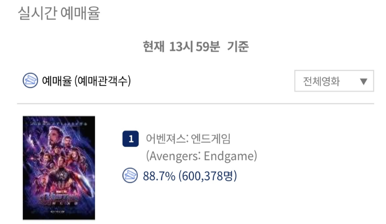 <어벤져스: 엔드게임>은 개봉 8일 전인 16일 오후 6시에 등급 심의가 완료됐다. 등급 심의가 끝나자마자 극장들은 예매 창구를 열었고, 예매가 열린 직후 CGV와 메가박스는 서버가 폭주하여 접속이 지연되는 사태까지 벌어졌다. 예매가 열린 후 5시간 만에 예매량 40만을 돌파했고, 17일 오후 2시를 기점으로 60만까지 넘어섰다. 현재 한국을 비롯해 세계 영화 시장에서 '마블'이란 타이틀이 가지는 위치는 확고하다. 이제 마블은 단순 시리즈를 넘어 하나의 트렌드이자, 문화로 자리 잡았다. 이렇게 마블이 관객을 사로잡는 데엔 크게 두 가지 마법을 사용했다. 캐릭터와 세계관.