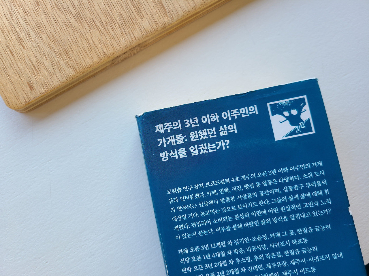 제주도 서쪽 옹포리에서 남쪽 서귀포 남원읍까지 갔는데 그냥 돌아오기는 아쉬워 근처 예쁜 카페에 들렀다. 중년 부부가 운영하는 조용한 카페였다. 우리는 바깥이 내다보이는 창가 자리에 앉아 거기에 놓여있는 파란색 책 한 권을 만지작거렸다. 아주 현실적인 책 제목, '제주의 3년 이하 이주민의 가게들: 원했던 삶의 방식을 일궜는가?'. 재생지로 엮은 꽤 두꺼운 책이었지만 자전거 약속 시간은 저녁 일곱 시, 책을 손에 넣은 건 오후 다섯 시. 우리는 책을 펼쳤다. 인터뷰집이었다.