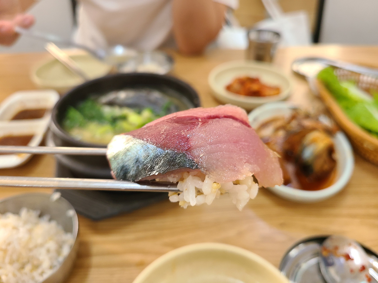 그다음부턴 초장 다신 간장을 찍어 먹었고 알려주신 대로 배춧잎에 싸서도 잘 먹었다. 하지만 계속 먹으니 느끼하다. 얼른 시원한 각재기국이 나와야 하는데, 싶어 카운터 쪽을 바라보니 우리를 힐끔힐끔 보고 계시던 아주머니와 눈이 마주친다. 아주머니는 기다리셨다는 듯 곧바로 우리 자리로 오셔서 고등어회가 먹을 만한지 먼저 물으셨다.