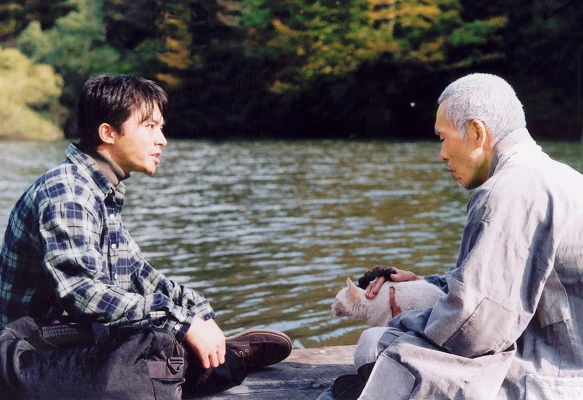 <봄 여름 가을 겨울 그리고 봄>은 대사가 많지 않다. 조용하고 적막한데, 사건이 일어난다. 절제된 대사와 인물의 움직임 사이의 여백은 계절이라는 배경과 호수 위에 떠 있는 암자의 모습이 채워준다. 등장인물도 노승, 동자승, 소녀, 소녀의 엄마, 형사1, 형사2, 아기엄마, 아기 이런식으로 한 사람씩 읊을 수 있다. 영화는 세상의 모습을 몇사람이 되지 않는 이들을 통해 충분히 보여준다. 등장하는 동물 개구리, 뱀, 물고기, 닭, 고양이의 비중도 무겁게 느껴진다. 결국은 함부로 대할 수 있는 것은 하나도 없다.