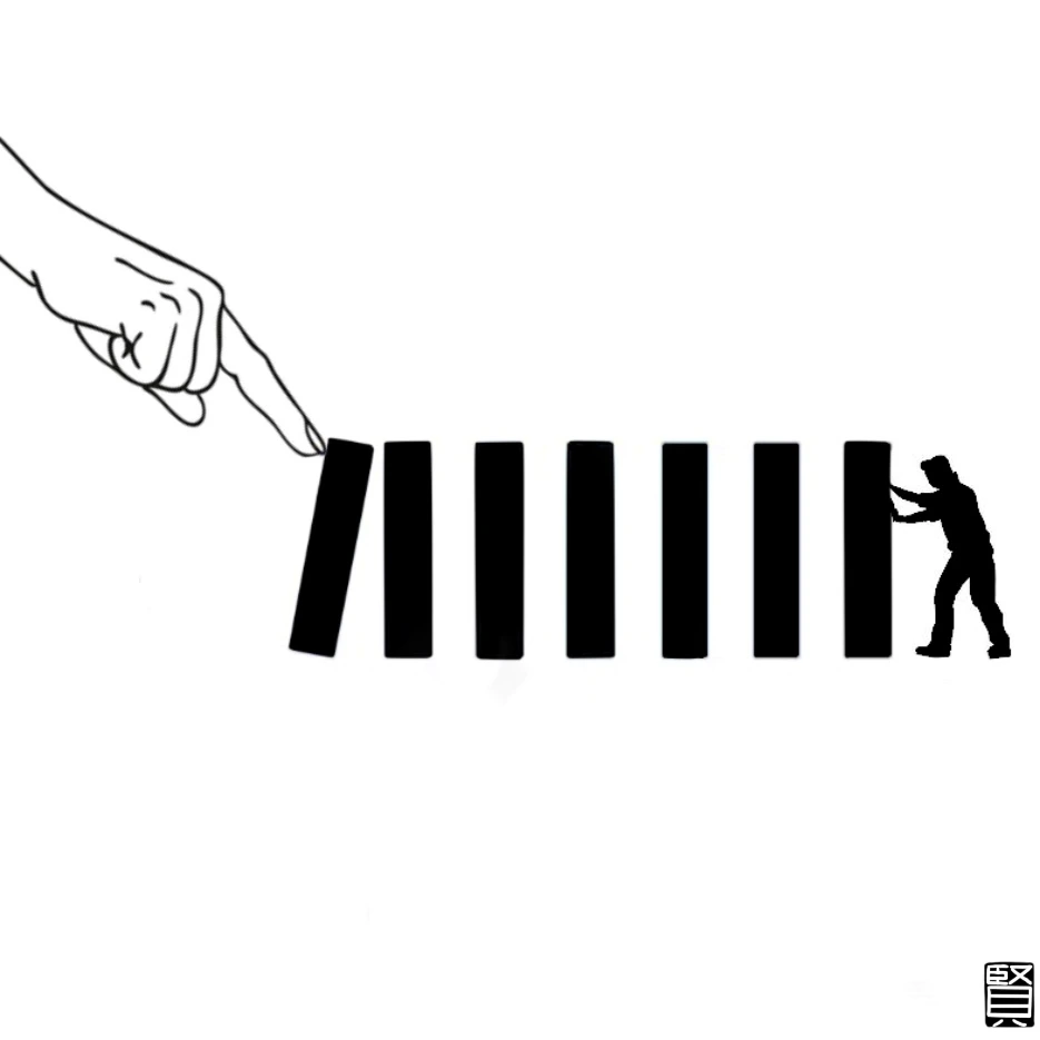 여러 개의 도미노 조각들이 도열해있는 그 끝에서
