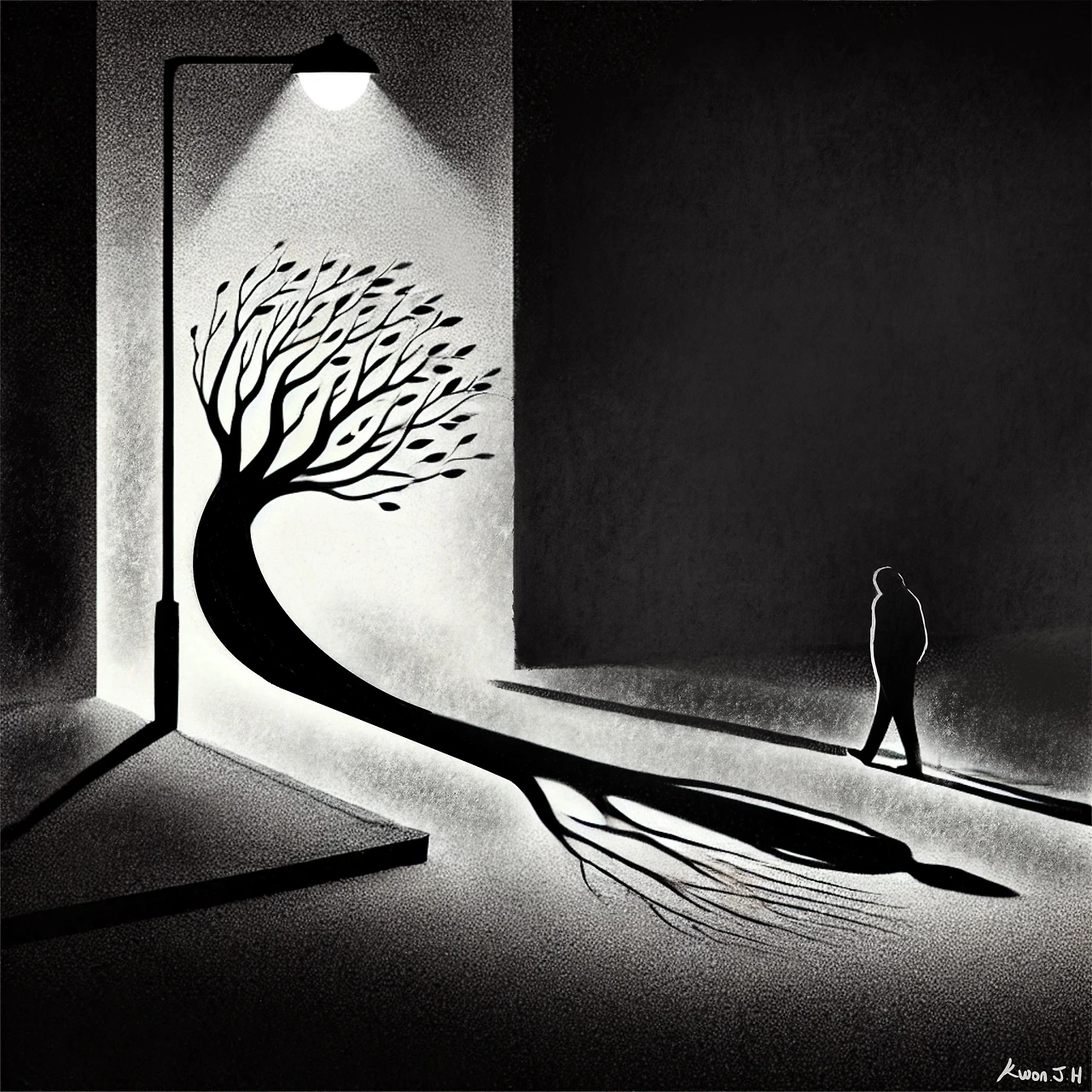 지친 발걸음이 한 걸음씩 어둠 속에 스며든다. 집으로 향하는 길은 생각보다 길고, 길 위의 불빛은 내 그림자를 어딘가로 끌고 가는 듯 하다. 저 멀리, 가로등 밑에서 흔들리는 낙엽처럼 내 마음도 조용히 떨린다.