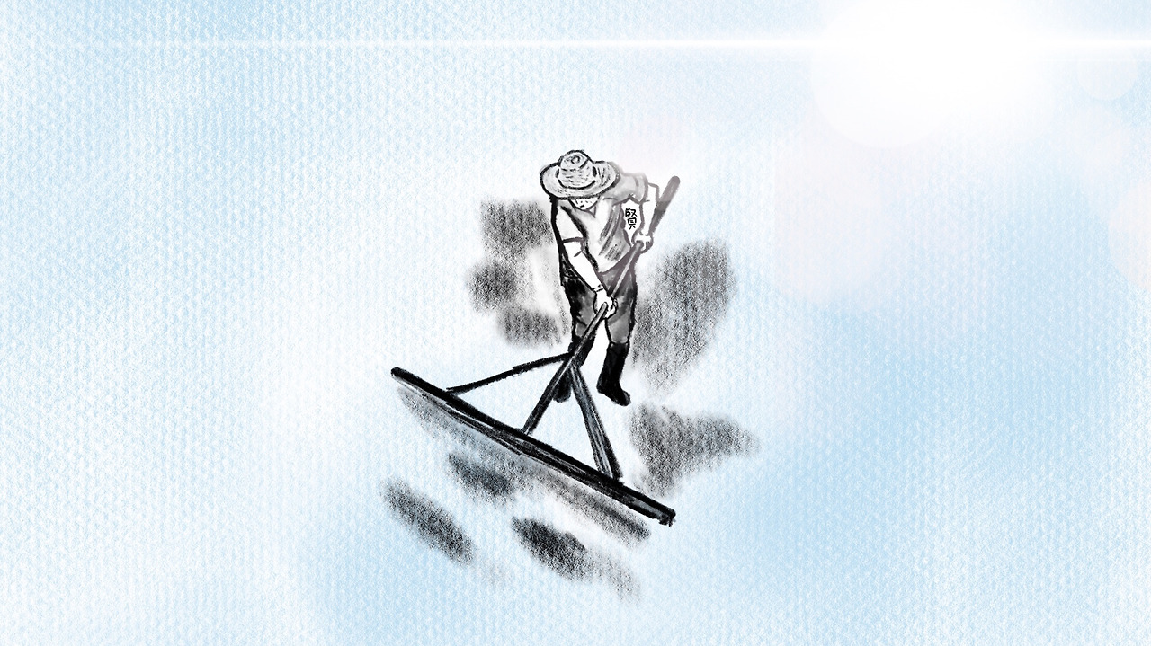 한여름 햇빛에 송글송글 맺힌 땀봉오리, 조심스레 고개를 내밀다 활짝 소금꽃을 틔운다. 염전을 일구는 소금꾼들은 소금보다 짠 구슬땀을 머금고 가랫대로 소금을 밀고 쓴다. 자식새끼 잘 키워보겠다고 소금이 눈에 들어가도 꾹 참고 모으면 금싸라기가 되어 주름진 얼굴에 웃음을 안기고, 한창 클 자식들은 애비의 거친 손 아래 다정히 크진 못하여도 그리 넉넉치 않은 살림 속 배 곯지 않고 크는 것만 해도 감사하다. 소금을 쓸고 담는 애비의 마음은 바다의 품과 같아서 하루, 이틀, 사흘, 나흘 꼬박 일년 열두달을 밀물과 썰물로 자식들에게 정을 주었다가도 엄한 마음 비치기를 거듭한다.