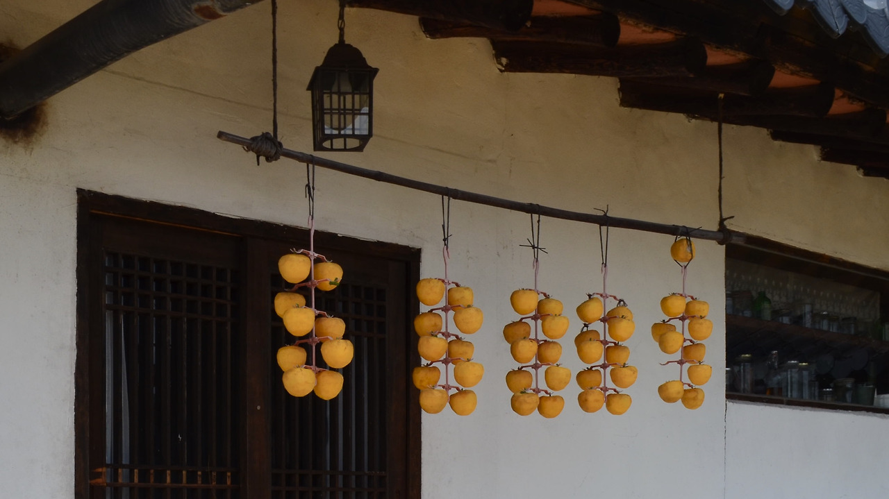 살갗 내놓은 감이 대롱대롱 바람에 몸을 맡기네
