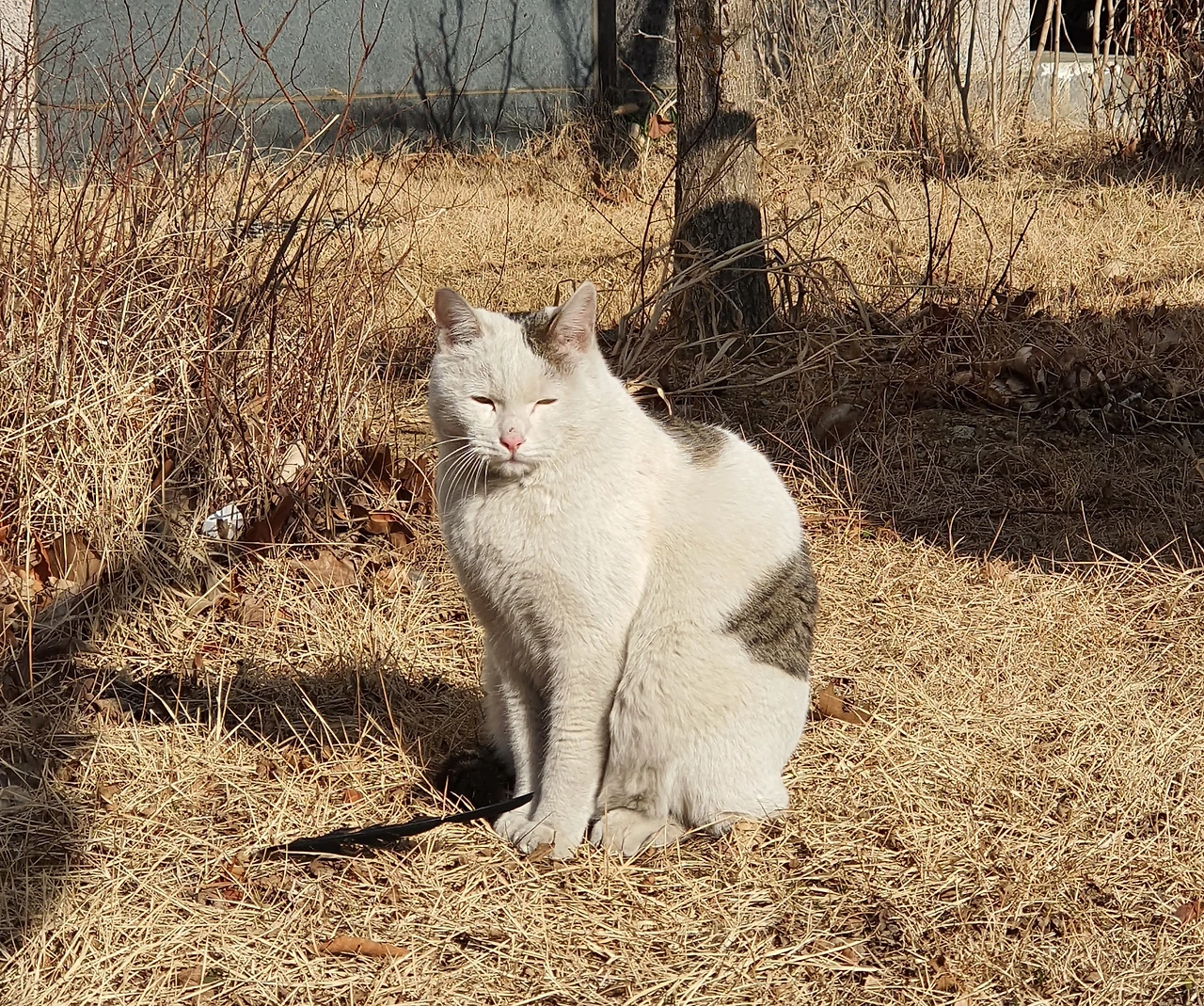 그러던 어느 날, 추운 겨울바람도 거스르는 따사로운 양지에서 햇볕을 즐기고 있는 고양이 발견!