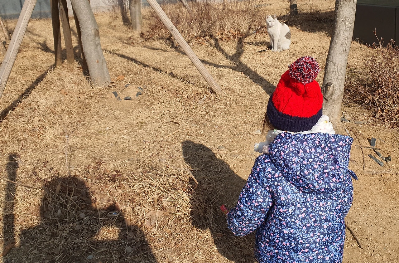 동네에 안 그래도 길고양이가 많지 않은데 추운 겨울에 만나니 이보다 더 반가울 순 없다! 동물을 너무나 좋아하는 둘째도 격하게 반가워한다. "야옹이야~ 야옹이야~"부르며 겁 없이 가까이 다가가는 모습이 귀엽기만 하다.