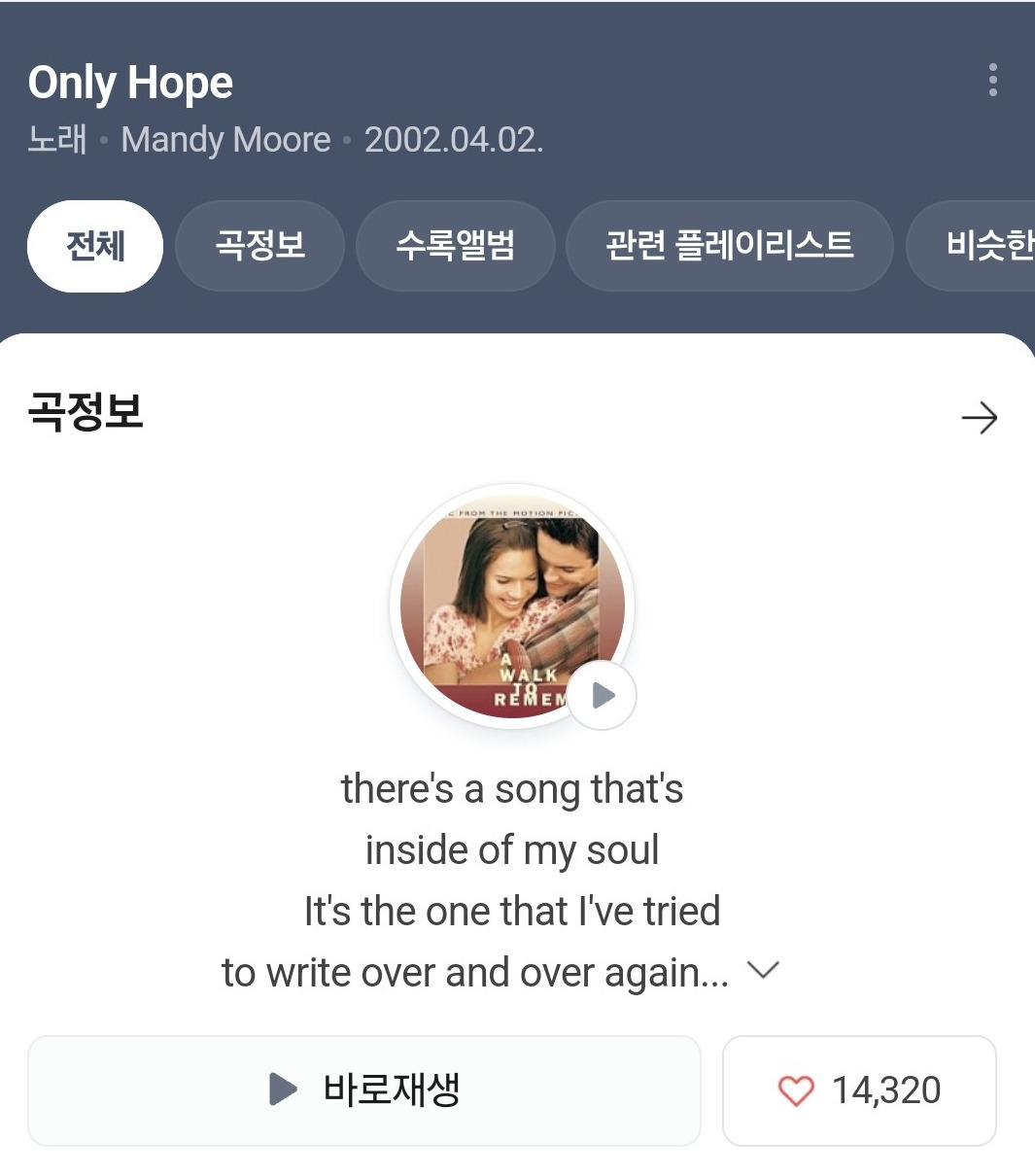 나의 페이보릿 노래. 맨디무어의 "Only hope"