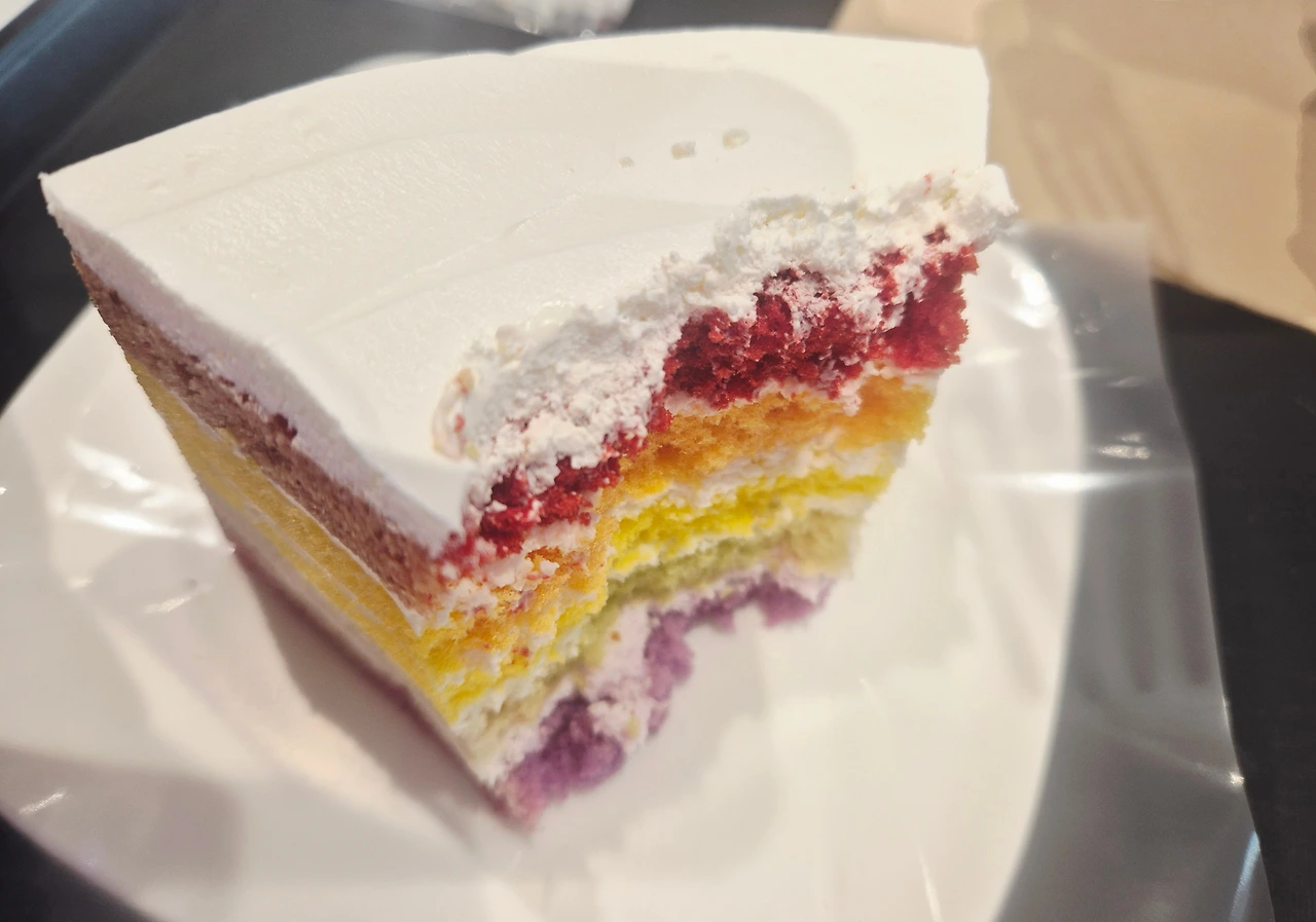순식간에 무지개케이크를 맛있게 먹는 아이를 보며
