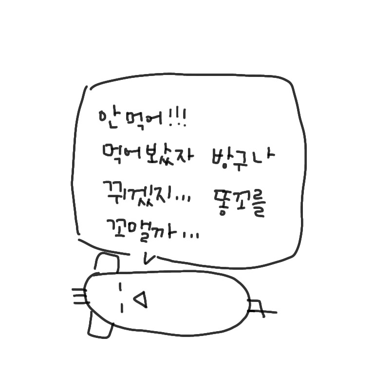 "안 먹을래~ 어차피 먹어봤자 방귀나 뀌겠지 나는 방귀 만드는 기계니까. 먹어봤자 방귀만 뀔 거야. 똥꼬를 꼬매야 하나...."