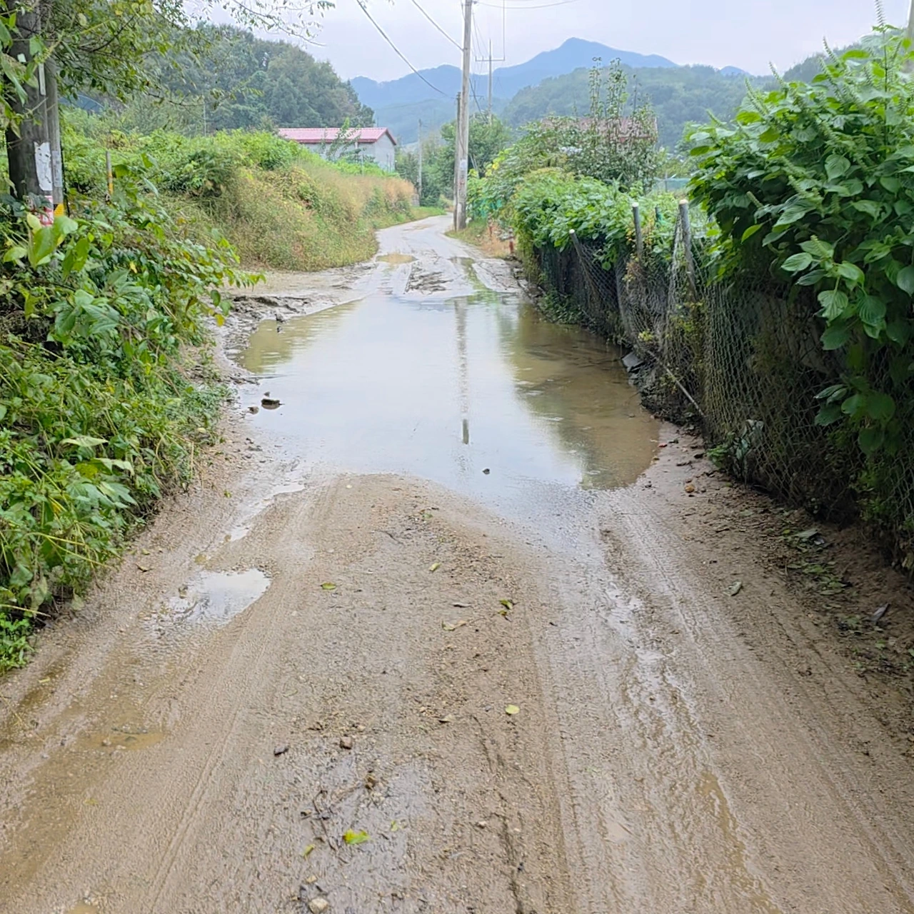 그 길을 따라 작은 산?을 하나 넘었다. 물에 잠긴 도로 덕에 신발도 흠뻑 수분보충을 할 수 있었고, 내 양말도 발목 뒤 흙탕물 덕에 리미티드 에디션이 되었다.