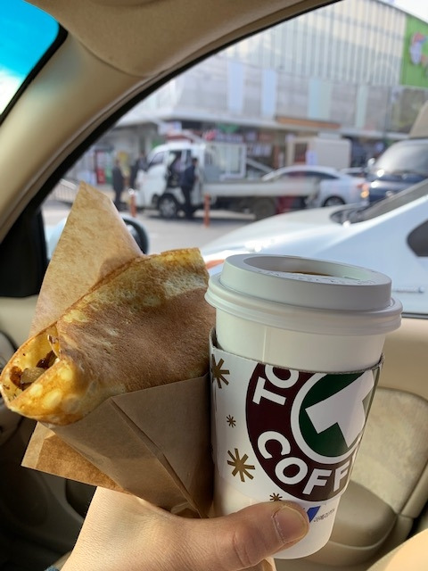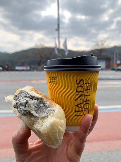 아침에 일어나 어제 산 샌드위치를 먹고 하동대 가는길 잠시 들려 달빵과 커피로 아침.
