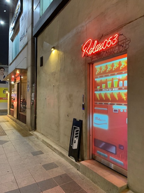 코너를 도니 자판기 이미지의 자동문이 보인다. 문이 열리고 여기도 힙합음악에 피자와 맥주를 파는 곳.