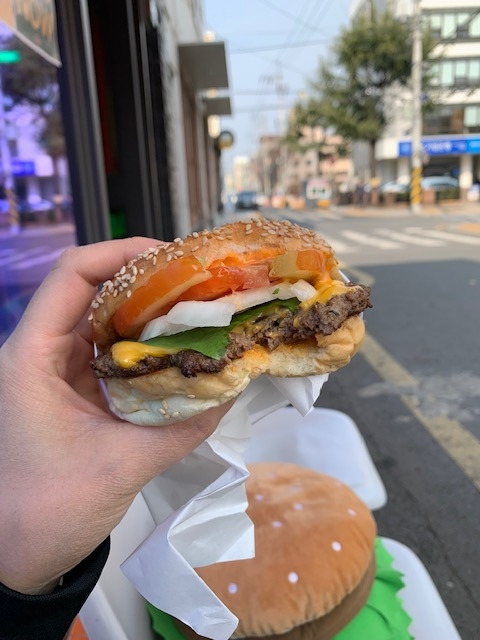 오일리 버거, 대구에 와서 아니 경상도에 와서 먹은것 중에 제일 맛있었다. 가게 앞 스피커 앞에 앉아 음악과 봄의 미세먼지와 함께 즐긴 햄버거. 이걸 먹으러 언젠가 다시 올게, 굿바이 대구.