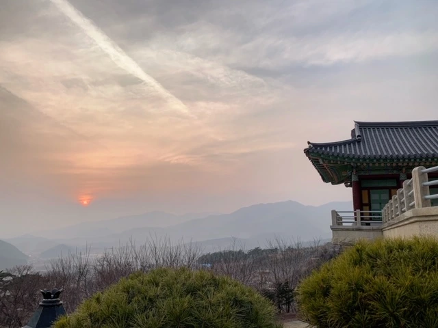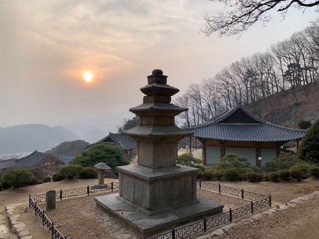 절 아래로 소백산과 멀리 마을이 보인다. 그 위로 해가 서서히 지는 걸 한참 동안 보았다.