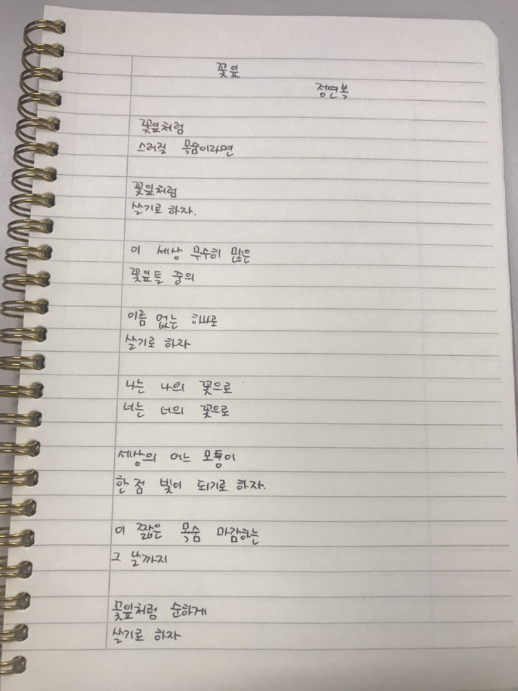 [1002] 꽃잎 - 정연복꽃잎처럼 스러질 목숨이라면꽃잎처럼 살기로 하자이 세상 무수히 많은 꽃잎들 중의이름 없는 하나로살기로 하자나는 나의 꽃으로너는 너의 꽃으로세상의 어느 모퉁이한 점 빛이 되기로 하자이 짧은 목숨 마감하는 그 날까지꽃잎처럼 순하게살기로 하자