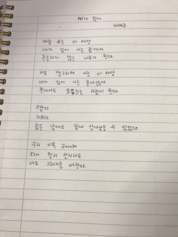[1107] 007_네가 있어 / 나태주바람 부는 이 세상네가 있어 나는 끝까지흔들리지 않는 나무가 된다서로 찡그리며 사는 이 세상네가 있어 나는 돌아앉아혼자서도 웃음 짓는 사람이 된다고맙다기쁘다힘든 날에도 끝내 살아남을 수 있었다우리 비록 헤어져오래 멀리 살지라도너도 그러기를 바란다