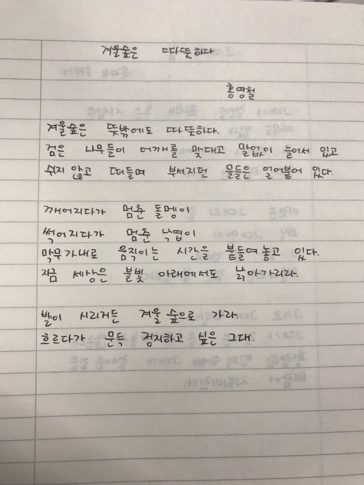 겨울 숲은 따뜻하다 / 홍영철겨울 숲은 뜻밖에도 따뜻하다검은 나무들이 어깨를 맞대고 말없이 늘어서 있고쉬지 않고 떠들며 부서지던 물들은 얼어붙어 있다깨어지다가 멈춘 돌멩이썩어지다가 멈춘 낙엽이막무가내로 움직이는 시간을 붙들어놓고 있다지금 세상은 불빛 아래에서도 낡아가리라발이 시리거든 겨울 숲으로 가라흐르다가 문득 정지하고 싶은 그때