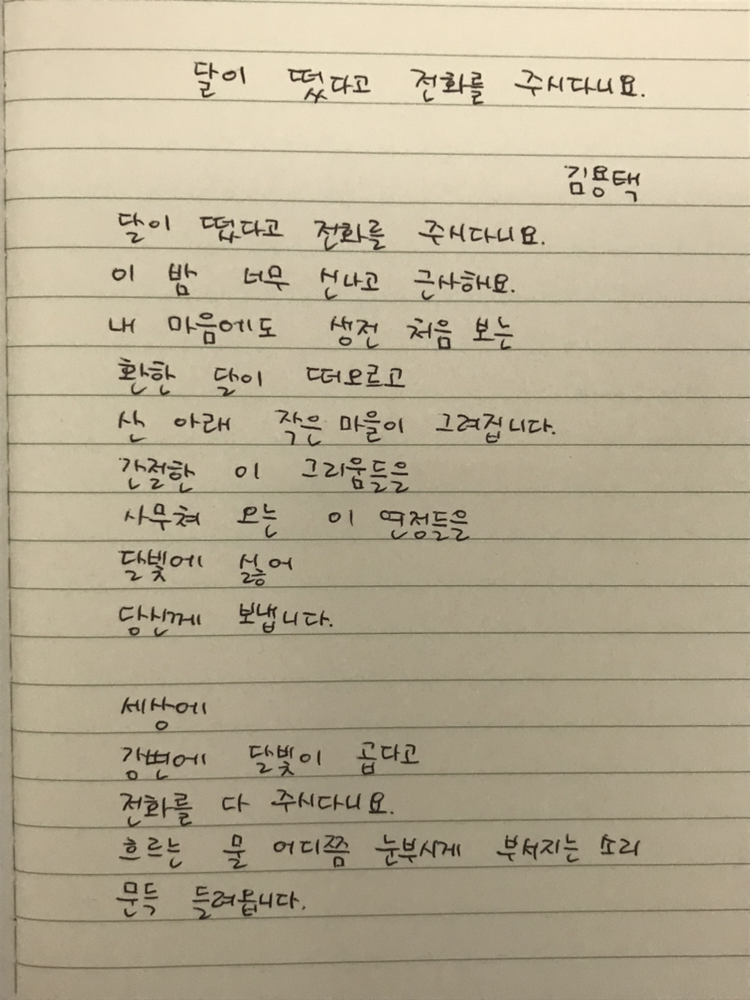 [0121] 달이 떴다고 전화를 주시다니요 by 김용택달이 떴다고 전화를 주시다니요이 밤 너무 신나고 근사해요내 마음에도 생전 처음 보는환한 달이 떠오르고산 아래 작은 마을이 그려집니다간절한 이 그리움들을사무쳐 오는 이 연정들을달빛에 실어당신께 보냅니다세상에강변에 달빛이 곱다고전화를 다 주시다니요흐르는 물 어디쯤 눈부시게 부서지는 소리문득 들려옵니다