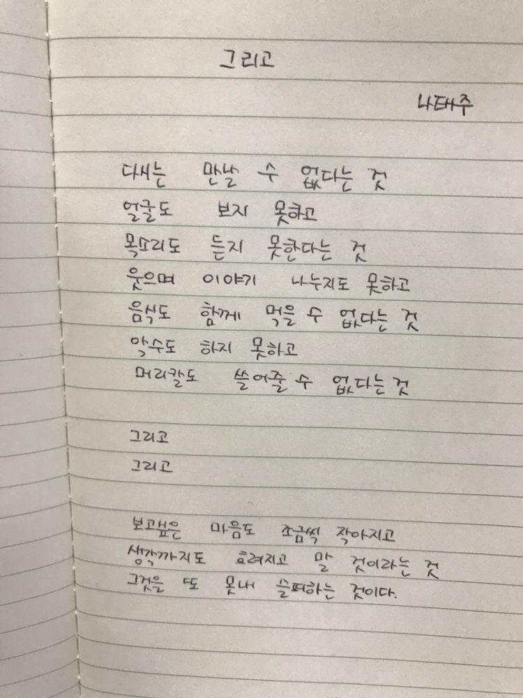 [0123] 그리고 by나태주다시는 만날 수 없다는 것얼굴도 보지 못하고목소리도 듣지 못한다는 것 웃으며 이야기 나누지도 못하고음식도 함께 먹을 수 없다는 것악수도 하지 못하고머리칼도 쓸어줄 수 없다는 것그리고그리고보고싶은 마음도 조금씩 작아지고생각까지도 흐려지고 말 것이라는 것그것을 또 못내 슬퍼하는 것이다