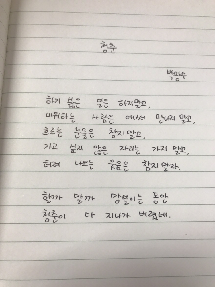 청춘 by 박광수하기 싫은 일은 하지말고,미워하는 사람은 애써 만나지 말고,흐르는 눈물은 참지 말고,가고 싶지 않은 자리는 가지 말고,터져 나오는 웃음은 참지 말자할까 말까 망설이는 동안청춘이 다 지나가 버렸네
