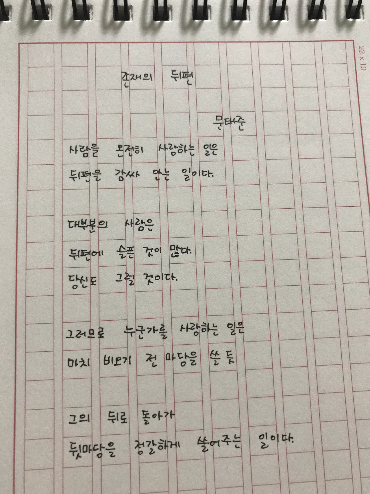[0203] 존재의 뒤편 by 문태준 사람을 온전히 사랑하는 일은뒤편을 감싸 안는 일이다 대부분의 사람은 뒤편에 슬픈 것이 많다당신도 그럴 것이다 그러므로 누군가를 사랑하는 일은마치 비오기 전 마당을 쓸 듯 그의 뒤로 돌아가뒷마당을 정갈하게 쓸어주는 일이다
