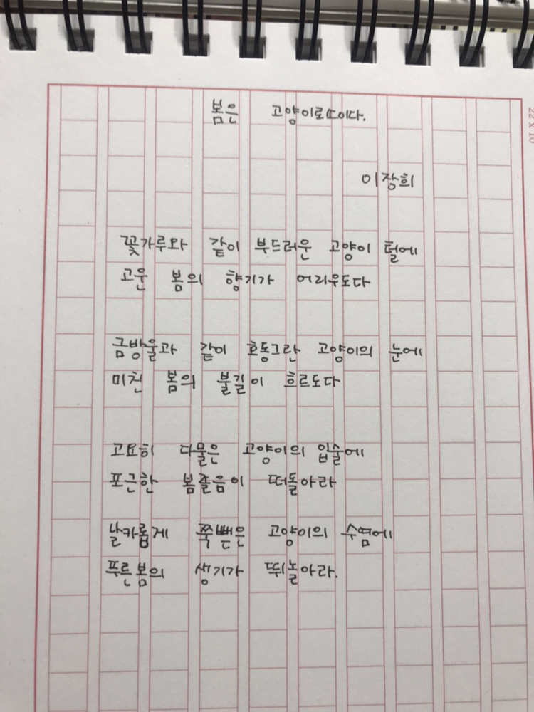 [0306] 봄은 고양이로소이다 by이장희꽃가루와 같이 부드러운 고양이의 털에 고운 봄의 향기가 어리우도다금방울과 같이 호동그란 고양이의 눈에미친 봄의 불길이 흐르도다고요히 다물은 고양이의 입술에포근한 봄졸음이 떠돌아라날카롭게 쭉뻗은 고양이의 수염에푸른봄의 생기가 뛰놀아라