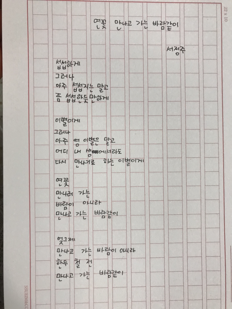 [0324] 연꽃 만나고 가는 바람같이 by 서정주섭섭하게 그러나 아주 섭섭지는 말고좀 섭섭한듯만하게 이별이게 그러나 아주 영 이별은 말고 어디 내 생에서라도 다시 만나기로 하는 이별이게 연꽃 만나러 가는 바람이 아니라 만나고 가는 바람같이 엊그제 만나고 가는 바람이 아니라 한두 철 전 만나고 가는 바람같이
