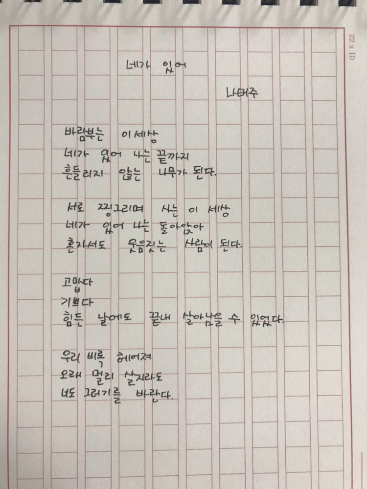 [0326] 네가 있어 by 나태주바람 부는 이 세상네가 있어 나는 끝까지흔들리지 않는 나무가 된다서로 찡그리며 사는 이 세상네가 있어 나는 돌아앉아혼자서도 웃음 짓는 사람이 된다고맙다기쁘다힘든 날에도 끝내 살아남을 수 있었다우리 비록 헤어져오래 멀리 살지라도너도 그러기를 바란다