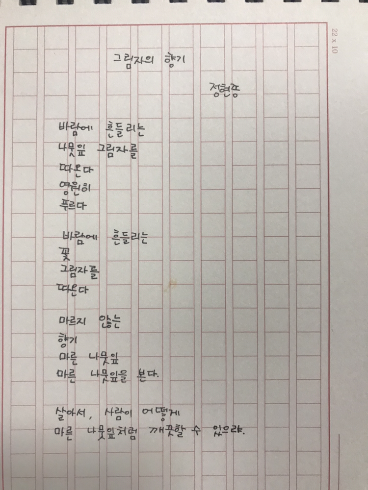 [0327] 그림자의 향기 -정현종 바람에 흔들리는나뭇잎 그림자를따온다영원히푸르다바람에 흔들리는꽃그림자를따온다마르지 않는향기 마른 나뭇잎 마른 나뭇잎을 본다.살아서, 사람이 어떻게마른 나뭇잎처럼 깨끗할 수 있으랴.