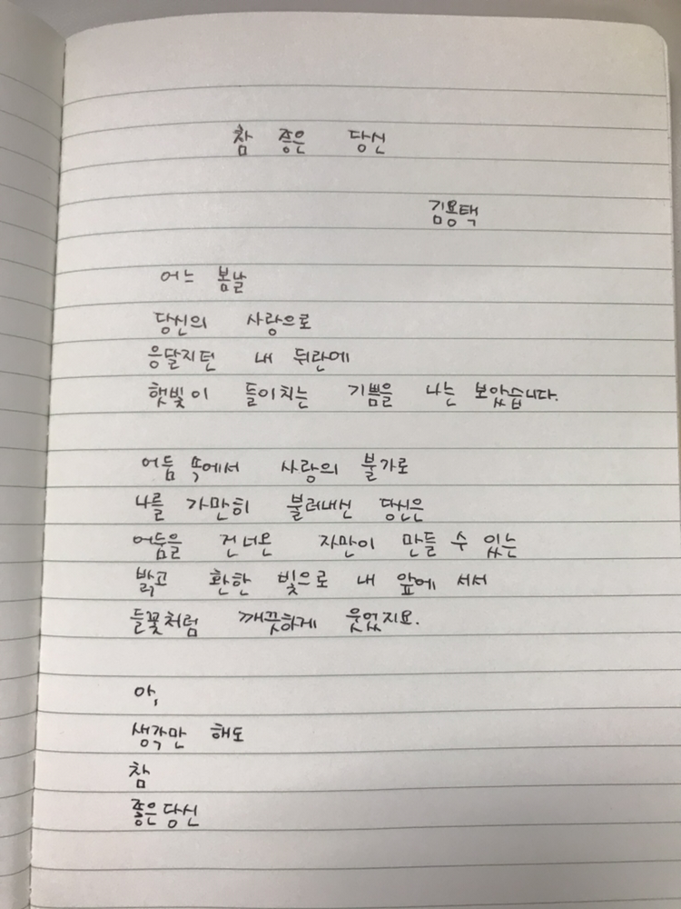 [0329]참 좋은 당신 by 김용택어느 봄날당신의 사랑으로응달지던 내 뒤란에햇빛이 들이치는 기쁨을 나는 보았습니다.어둠 속에서 사랑의 불가로나를 가만히 불러내신 당신은어둠을 건너온 자만이 만들 수 있는밝고 환한 빛으로 내 앞에 서서들꽃처럼 깨끗하게 웃었지요.아,생각만 해도참좋은당신