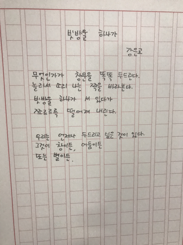 [0407] 빗방울 하나가 by 강은교무엇인가가 창문을 똑똑 두드린다.놀라서 소리 나는 쪽을 바라본다.빗방울 하나가 서 있다가쪼르르륵 떨어져 내린다.우리는 언제나 두드리고 싶은 것이 있다.그것이 창이 든, 어둠이든또는 별이든.