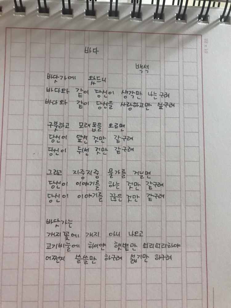 [0417] 바다 - 백석 바닷가에 왔드니바다와 같이 당신이 생각만 나는구려바다와 같이 당신을 사랑하고만 싶구려 구붓하고 모래톱을 오르면당신이 앞선 것만 같구려당신이 뒤선 것만 같구려 그리고 지중지중 물가를 거닐면당신이 이야기를 하는 것만 같구려당신이 이야기를 끊은 것만 같구려 바닷가는개지꽃에 개지 아니 나오고고기비눌에 하이얀 햇볕만 쇠리쇠리하야어쩐지 쓸쓸만 하구려 섧기만 하구려