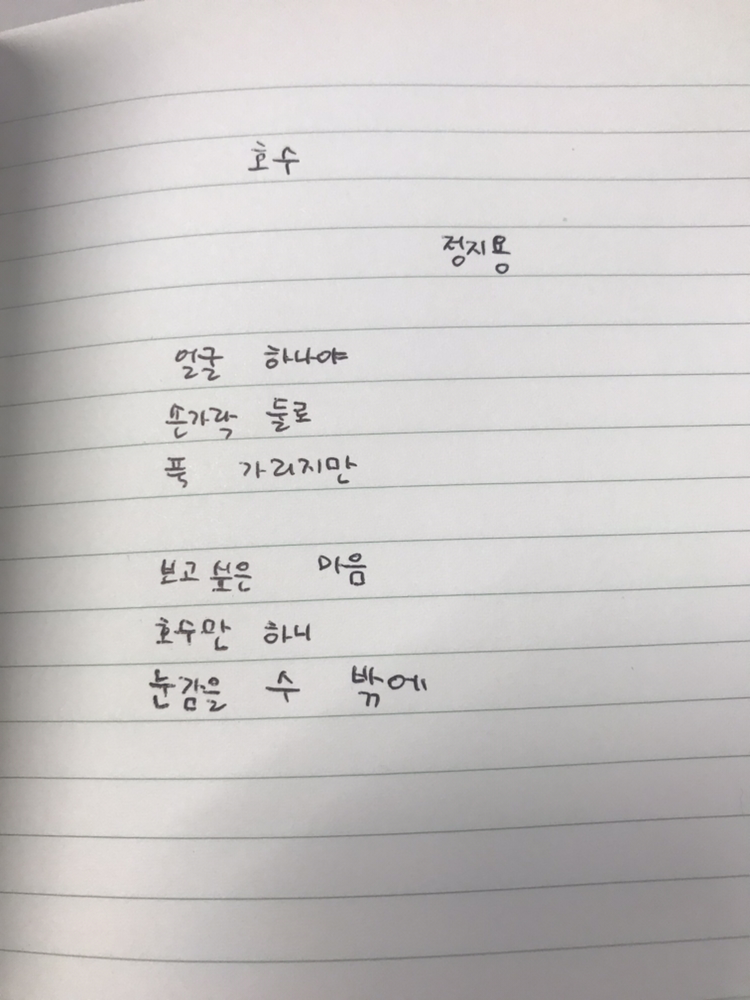 호수 -정지용 얼굴 하나야 손가락 둘로 푹 가리지만 보고싶은 마음 호수만 하니 눈 감을 수 밖에