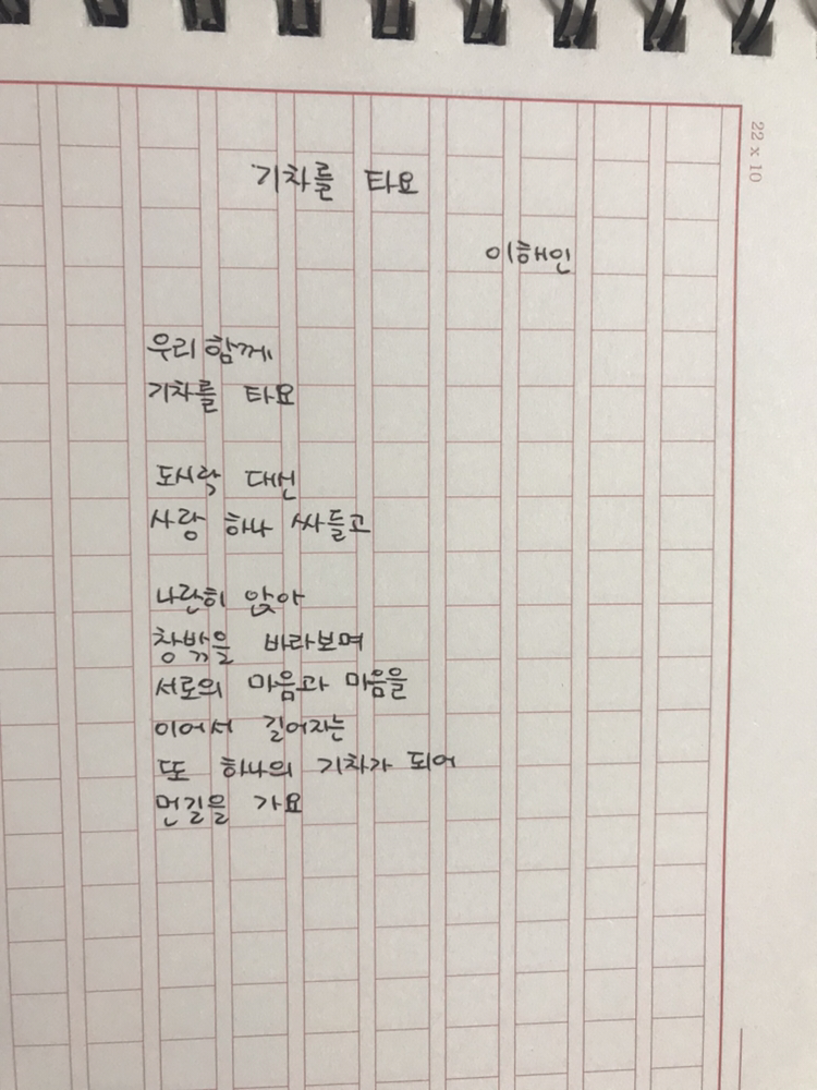 기차를 타요 by 이해인 우리 함께기차를 타요 도시락 대신사랑 하나 싸들고 나란히 앉아창밖을 바라보며서로의 마음과 마음을이어서 길어지는또 하나의 기차가 되어먼 길을 가요