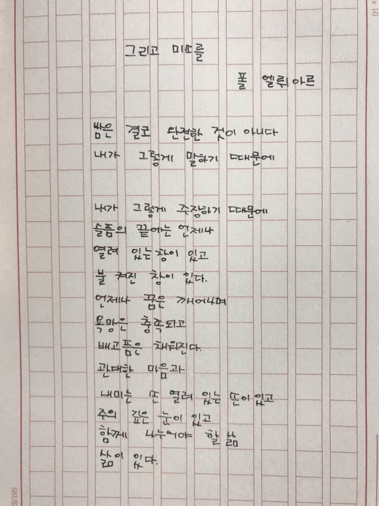 그리고 미소를 - 폴 엘뤼아르밤은 결코 완전한 것이 아니다 내가 그렇게 말하기 때문에 내가 그렇게 주장하기 때문에 슬픔의 끝에는 언제나 열려 있는 창이 있고 불 켜진 창이 있다. 언제나 꿈은 깨어나며 욕망은 충족되고 배고픔은 채워진다. 관대한 마음과 내미는 손 열려 있는 손이 있고 주의 깊은 눈이 있고 함께 나누어야 할 삶 삶이 있다.