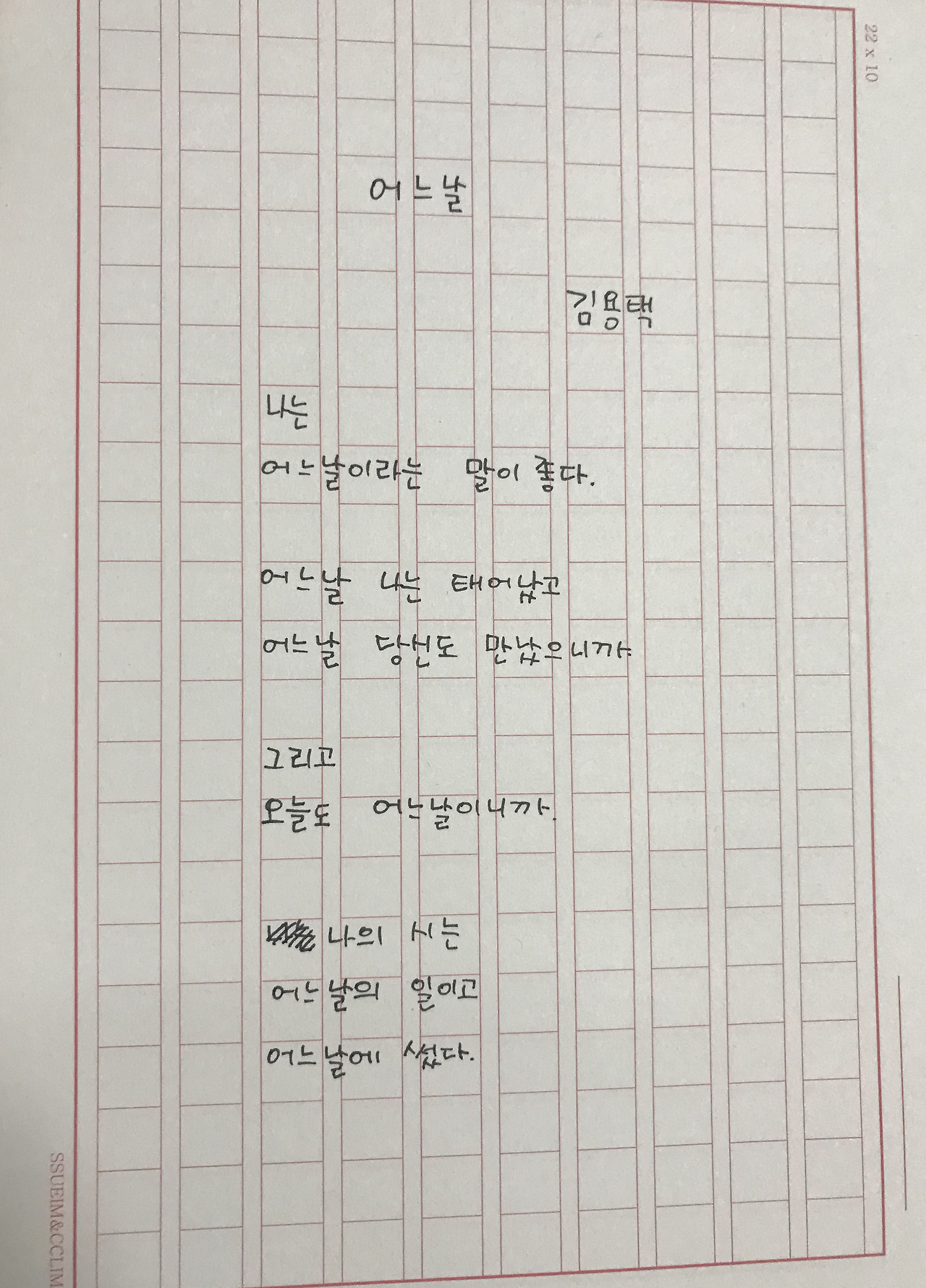[0516] 어느날, 김용택나는어느날이라는 말이 좋다.어느날 나는 태어났고어느날 당신도 만났으니까.그리고오늘도 어느날이니까.나의 시는어느날의 일이고어느날에 썼다.