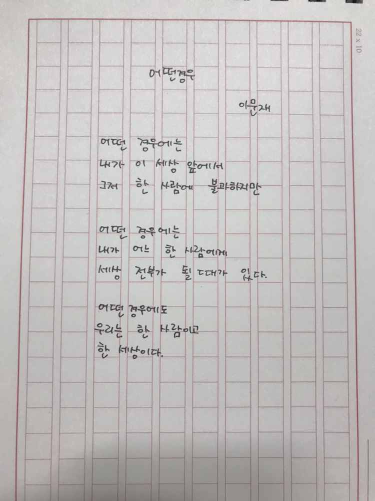 어떤 경우 - 이문재어떤 경우에는 내가 이 세상 앞에서 그저 한 사람에 불과하지만어떤 경우에는내가 어느 한 사람에게세상 전부가 될 때가 있다어떤 경우에도우리는 한 사람이고한 세상이다